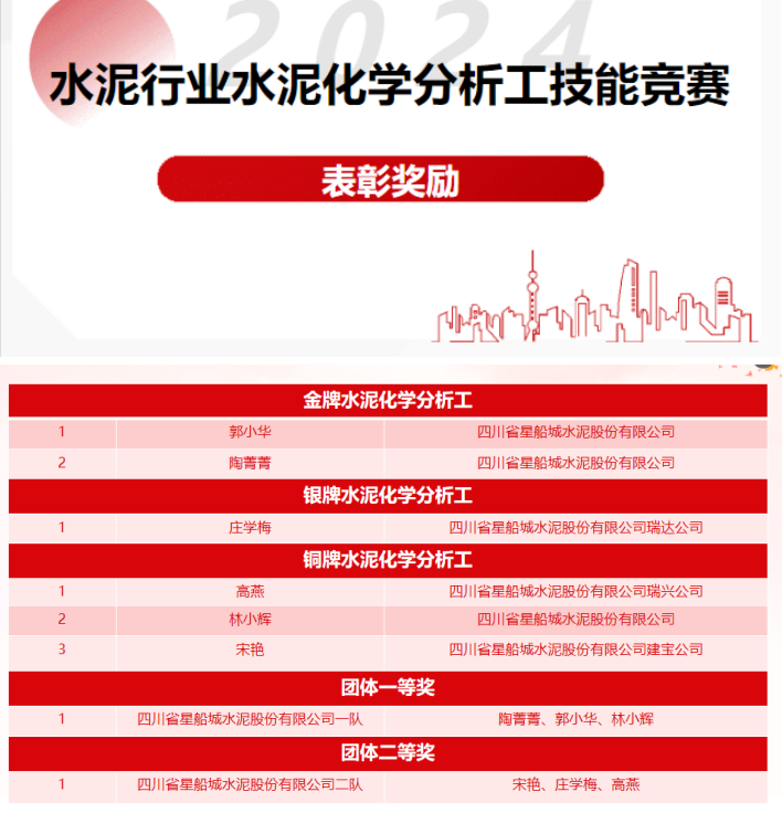9月24日,由中國水泥協(xié)會發(fā)布關于《2024年水泥行業(yè)水泥化學分析工技能競賽》表彰獎勵的決定,對8月22日至26日,在四川綿陽舉行的2024年全國水泥化學分析工技能競賽中涌現(xiàn)出來的優(yōu)秀選手和單位進行表彰。其中,星船城公司共6名參賽選手在總共60名參加決賽的選手中脫穎而出,郭小華以總成績第1名、陶菁菁以第3名的成績,榮獲“金牌水泥化學分析工”稱號;莊學梅榮獲“銀牌水泥化學分析工”稱號;高燕、林小輝、宋艷榮獲“銅牌水泥化學分析工”稱號。星船城公司一隊(陶菁菁、郭小華、林小輝)以總成績第一名榮獲團體一等獎;星船城公司二隊(宋艷、莊學梅、高燕)以總成績第八名榮獲團體二等獎;實現(xiàn)全部參賽選手進入決賽、全部獲得個人競賽獎及團體一、二等獎的歷史最佳戰(zhàn)績。
